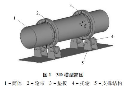 本文以某款谷物類烘干機(jī)為研究對(duì)象,烘干機(jī)一般包括干燥系統(tǒng)、上料系統(tǒng)、熱風(fēng)爐系統(tǒng)、出料系統(tǒng)、引風(fēng)系統(tǒng)、控制系統(tǒng)與安全系統(tǒng)。干燥系統(tǒng)是其最為關(guān)鍵的系統(tǒng),主要組成部件為筒體、輪帶、墊板、托輪和支撐結(jié)構(gòu),其中筒體、墊板和輪帶都為設(shè)備運(yùn)行過程中主要的受力部件,且易發(fā)生失效,而托輪和支撐結(jié)構(gòu)所受為體積力,均布于整個(gè)結(jié)構(gòu)系統(tǒng),一般不會(huì)發(fā)生應(yīng)力失效。